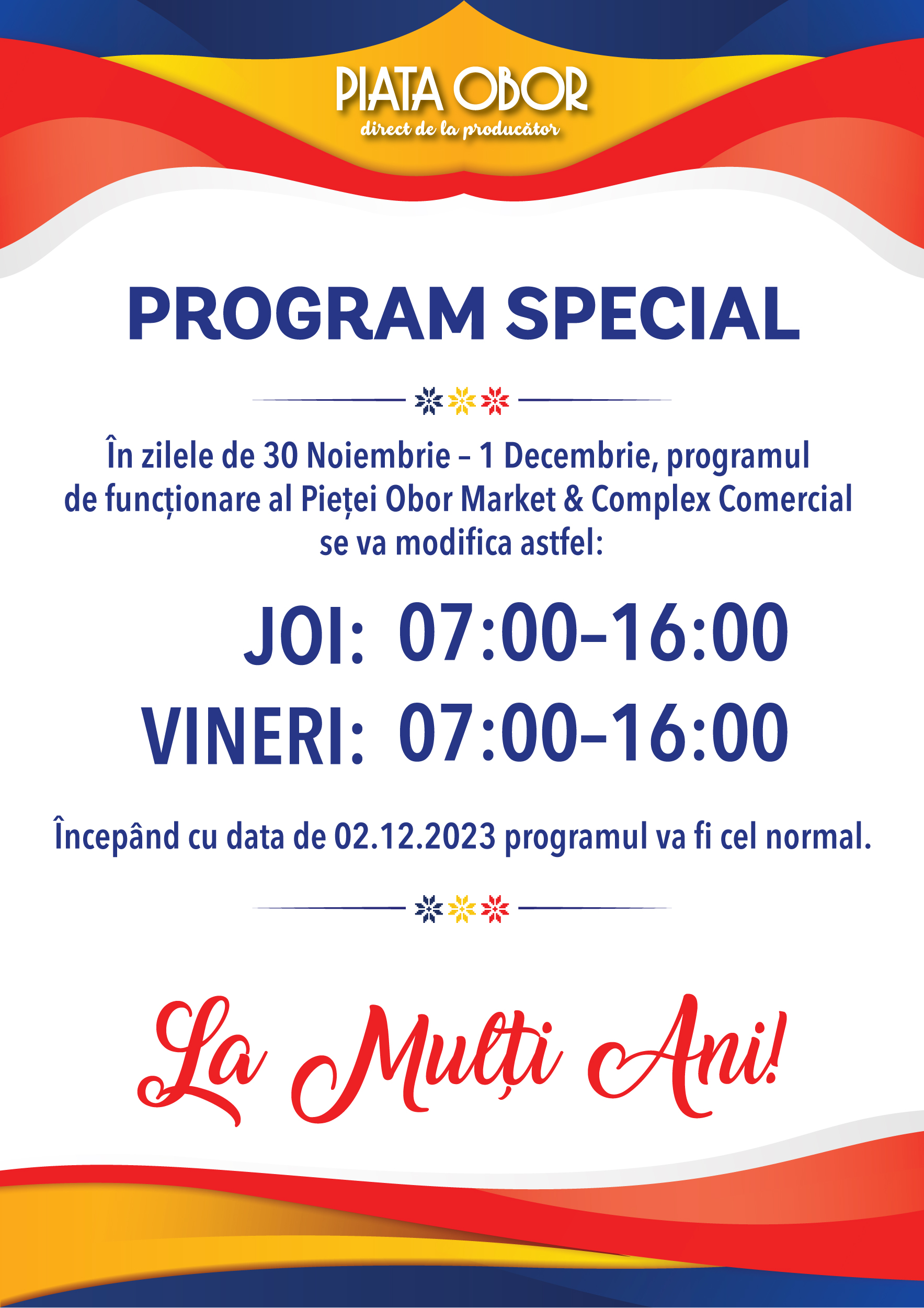 În zilele de 30 Noiembrie – 1 Decembrie, programul de funcționare al Pieței Obor Market & Complex Comercial se va modifica astfel:
